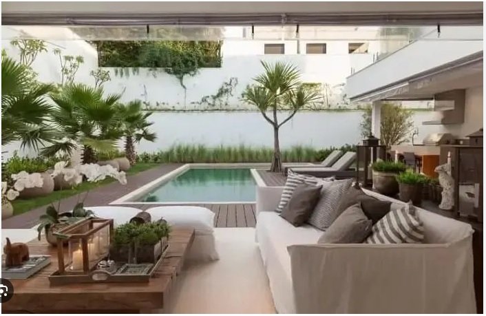 - Quarto, Churrasqueira, Piscina, Lavanderia, Ducha, Paisagismo, TV, Som